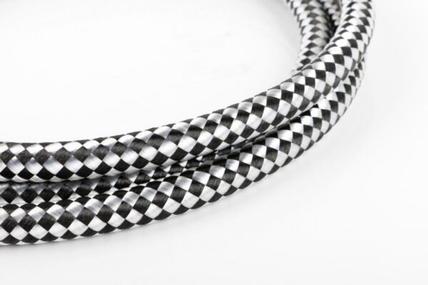Der Außenmantel aus PVC (Ø 10,0 mm) mit schwarz-weißem Baumwollgeflecht schützt effektiv vor Biegung, Abrieb und Zugbelastungen. Die Schraub-/Klemm-RCA-Stecker mit vergoldeten Kontakten und Metallhülse bieten langlebige Kontaktqualität und ermöglichen sicheren Halt an den Buchsen.