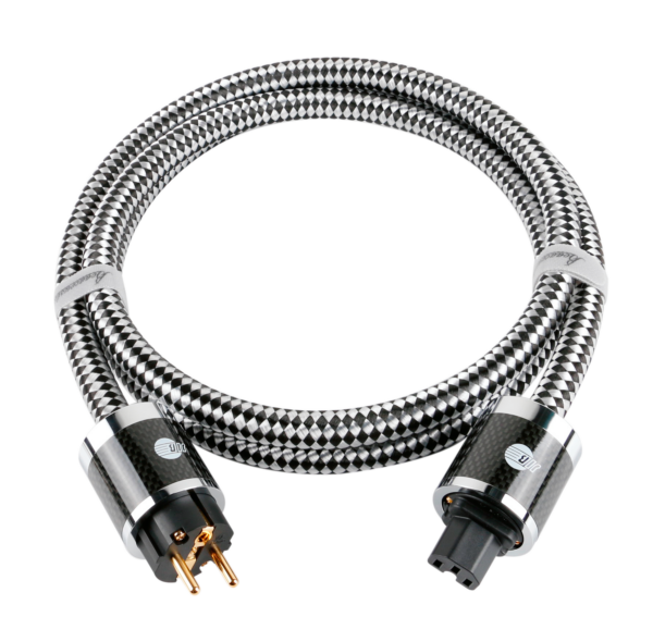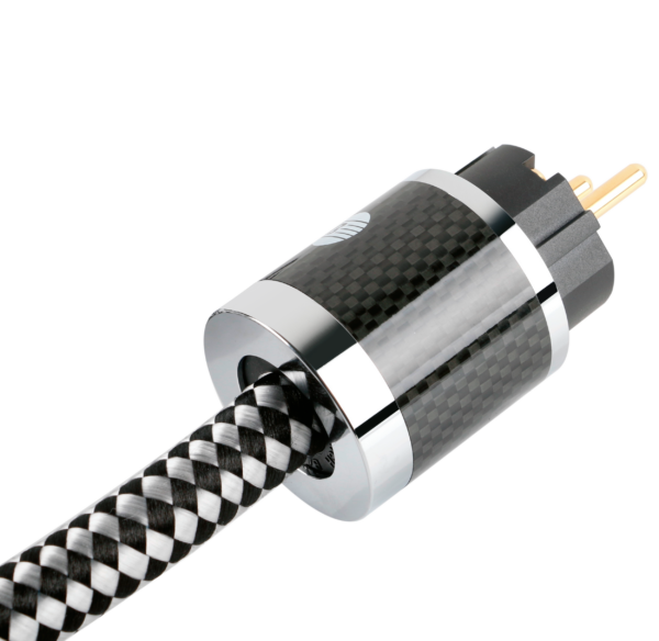 Das Kabel ist durch mehrere Materialschichten vor Abrieb, Knicken und Zugbelastung geschützt. Der PVC-Aufbau in Kombination mit dem Baumwollgewebe sorgt für Dämpfung und strukturelle Stabilität. Die Schuko- und IEC-C15-Stecker mit vergoldeten Kontaktflächen und Carbonfaserhülsen gewährleisten dauerhaft sichere Verbindungspunkte und minimieren Kontaktwiderstand.