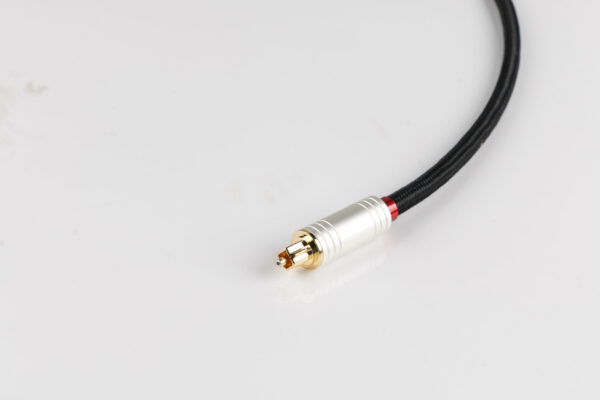 Der zentrale PMMA-Lichtleiter mit Ø 1,0 mm bildet das optische Herzstück des Kabels und gewährleistet eine exakte Lichtführung. Die PE-Isolierung mit Ø 2,2 mm stabilisiert den Kern und schützt ihn vor Mikrobewegungen, die die Signalqualität beeinträchtigen könnten. Ein PVC-Innenmantel sowie ein PVC-Außenmantel mit Ø 6,0 mm sichern die strukturelle Stabilität. Das abschließende Baumwollgeflecht erhöht die Abriebfestigkeit und sorgt für eine hochwertige, griffige Haptik.