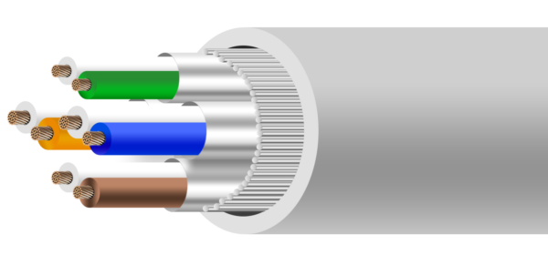 Die acht Adern bestehen jeweils aus sieben feindrahtigen BC-Litzen mit einem Durchmesser von 0,142 mm. Die FPE-Isolierung mit Ø 1,0 mm stabilisiert die Leitungsgeometrie und verhindert Signalverformungen. Jedes Aderpaar ist einzeln mit Aluminiumfolie ummantelt. Eine weitere Schirmung aus Aluminiumfolie und einem dichten Geflecht aus 15 × 5 × Ø 0,12 mm bietet zusätzlichen Schutz.