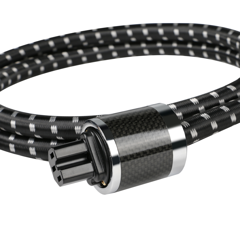 Der Schuko-Netzstecker und die IEC-C15-Kaltgerätebuchse sind mit vergoldeten Kontakten, massiven Metallgehäusen und Carbonfaserhülsen ausgestattet – stabil, korrosionsfest und kontaktstark.
