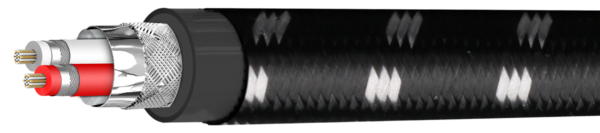 Im Inneren des Evolution BLACK.rca2 (BEB-2002) befinden sich zwei Leitergruppen aus jeweils 14 × Ø 0,12 mm Silberlitzen und 14 × Ø 0,12 mm OFC. Die verlustarme LD-PE-Isolierung mit 1,75 mm Durchmesser hält die Kapazität niedrig und verbessert die Signalstabilität. Papierband, Mylarfolie und eine zusätzliche LD-PE-Zwischenschicht erhöhen die strukturelle Stabilität und verhindern mikrofonische Effekte.