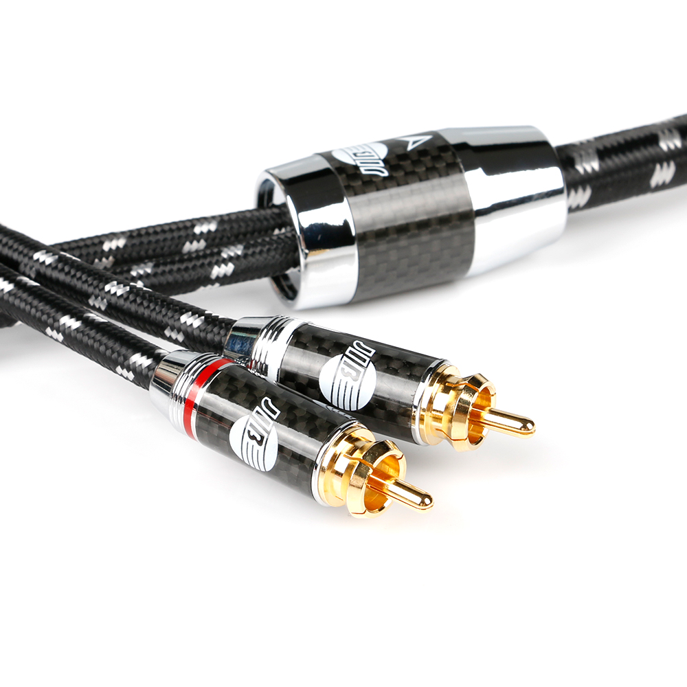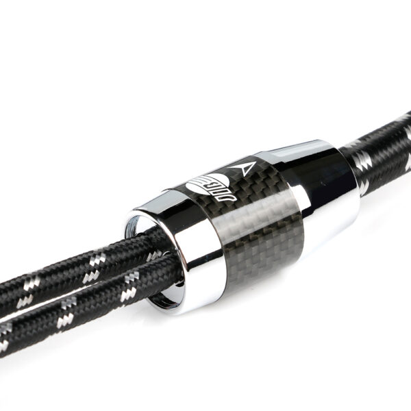 Der mehrschichtige Aufbau einschließlich LD-PE-Tragstruktur und Mylar-Schutzfolie wird durch einen robusten PVC-Außenmantel (Ø 11,8 mm) mit schwarz-weißem Baumwollgeflecht geschützt. Die vergoldeten RCA-Stecker mit Metall- und Carbonfaserhülse gewährleisten sichere Kontaktflächen und korrosionsbeständige Verbindungspunkte. Die farbcodierte Markierung erleichtert eine fehlerfreie Kanalzuordnung.