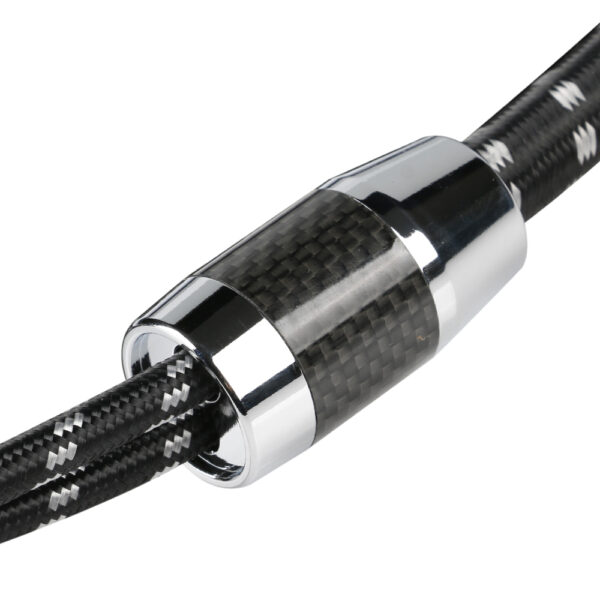 Der robuste PVC-Innenmantel (Ø 15,8 mm) mit eng geflochtenem Baumwollgewebe bietet hervorragenden Schutz gegen Abrieb, Torsion und Knicke. Das Kabel bleibt trotz seiner massiven Struktur flexibel und montagefreundlich. Die vergoldeten, austauschbaren Stecker mit Metall- und Carbonfaserhülse können als Banana- oder Gabelversion genutzt werden. Mittelstücke mit Pfeilmarkierungen erleichtern die richtungsgebundene Installation und verhindern Verpolung.